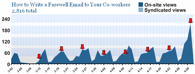 I have a post on this blog that’s been up for nearly two months now. How to Write a Farewell Email to Your Co-Workers provides a humorous look at that ritual of leaving companies, the farewell email. Given that people tend to leave on Fridays, the page views of this post follow a predictable path, increasing each day to a weekly high on Friday.