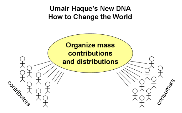 The new DNA to which Umair refers is the web 2.0 ethos – people’s contributions and ideas create new value in hidebound industries. Also note that in both cases there was an organizer for people’s contributions. Google for web pages, Muhammed Yunus for the solicitation of capital. Here’s a graphical depiction of what he’s talking about: