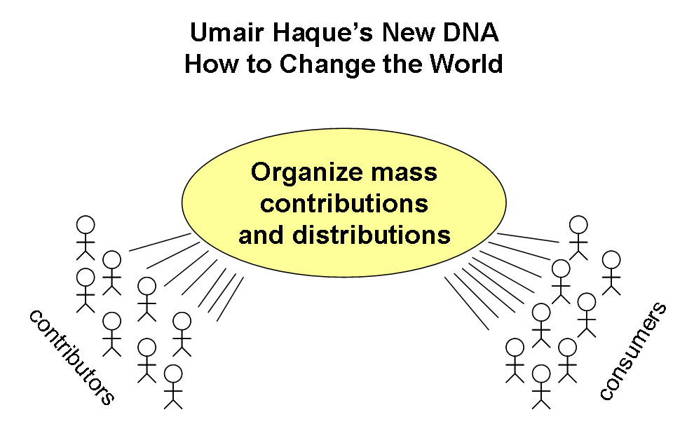 The new DNA to which Umair refers is the web 2.0 ethos – people’s contributions and ideas create new value in hidebound industries. Also note that in both cases there was an organizer for people’s contributions. Google for web pages, Muhammed Yunus for the solicitation of capital. Here’s a graphical depiction of what he’s talking about:
