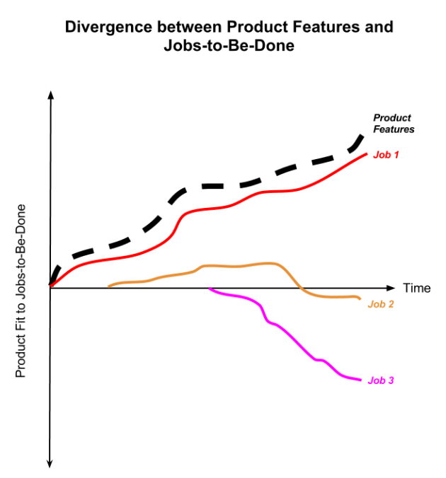 When a company “makes it” in the market, it has the features that meet what customers are trying to get done. On the graph above, that’s set as “Time 0”, where features match Job 1. Given this is the ticket to success, a company will of course continue to develop these features. And the people who were looking for Job 1 fulfilled will follow along as the new features are rolled out.