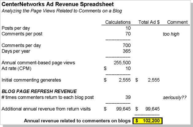 Allen wrote most the calculations below in his blog post. I did have to make some assumptions to hit the $100,000 annual revenue level he associated to commenter page views.