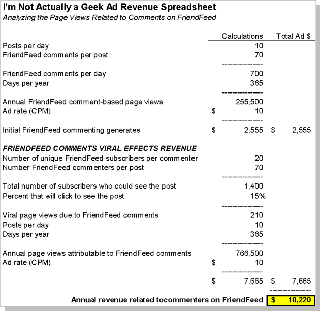 The numbers sounded aggressive to me, so I wanted to give some consideration to Allen’s calculations. I also created a separate spreadsheet that estimates the ad revenue generated from comments on FriendFeed. The tables are presented below.