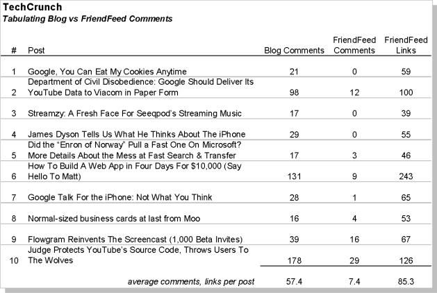 For most blogs that don’t generate 70 comments per post, the viral attention features of FriendFeed hold greater benefit than comments on the blog itself. Look at the ratio of FriendFeed links-to-comments for TechCrunch: