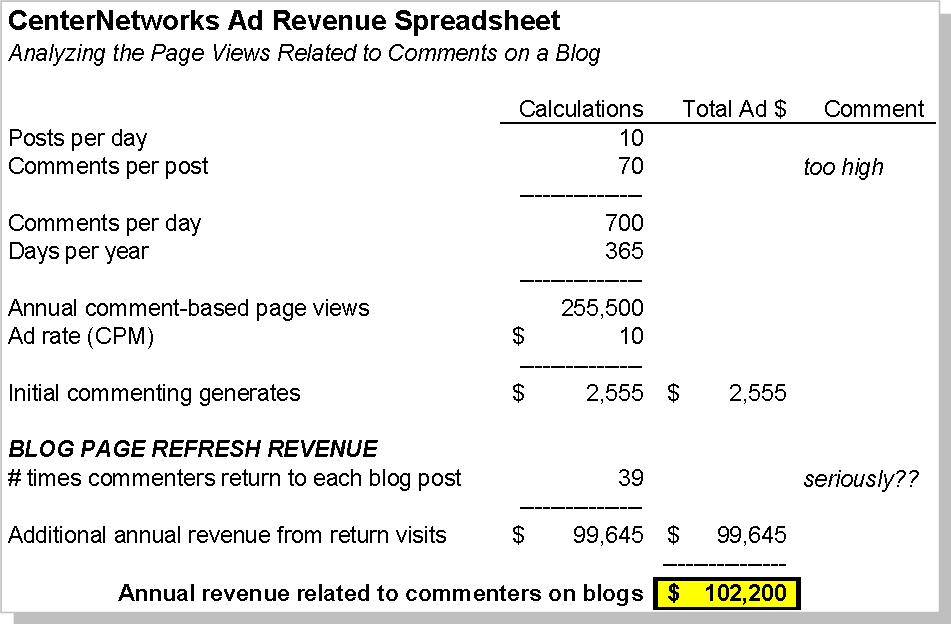 Allen wrote most the calculations below in his blog post. I did have to make some assumptions to hit the $100,000 annual revenue level he associated to commenter page views.